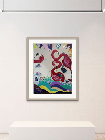 A thought-provoking artwork that invites introspection. This painting is a visual representation of the journey of life, represented by three flamingos. The past is symbolized by a flamingo with missing parts, representing moments of regret and experiences that do not define us. The present, depicted as a proud and happy flamingo, is the shortest moment and the most challenging to grasp. The future, represented by only the head of a flamingo, represents endless possibilities and a bright future yet to be formed. This artwork is a powerful reminder that life is constantly evolving and that we have the power to shape our future. Dive into this thought-provoking masterpiece and be inspired to embrace the present and create the future you desire.